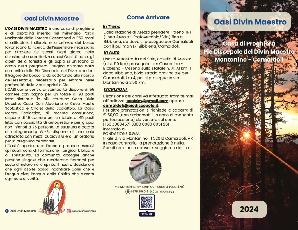 L'Oasi Divin Maestro è una Casa di Preghiera che accoglie sacerdoti, religiosi/e e laici desiderosi di vivere giornate in solitudine nel silenzio e nella preghiera.